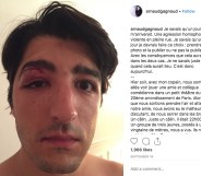 “Sorry to show you this,” he wrote. “It’s the face of homophobia. Last night 19th arrondissement, Paris, Olivier and I were badly beaten just for walking arm in arm. I woke up in an ambulance covered in blood, missing tooth and broken bones around the eye. I’m home now. Very sad.”