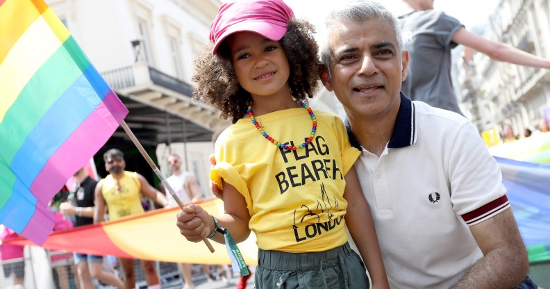 Mayor of London Sadiq Khan with a young flag bearer during the Pride In London parade on July 7, 2018 in London, England. (Tristan Fewings/Getty)