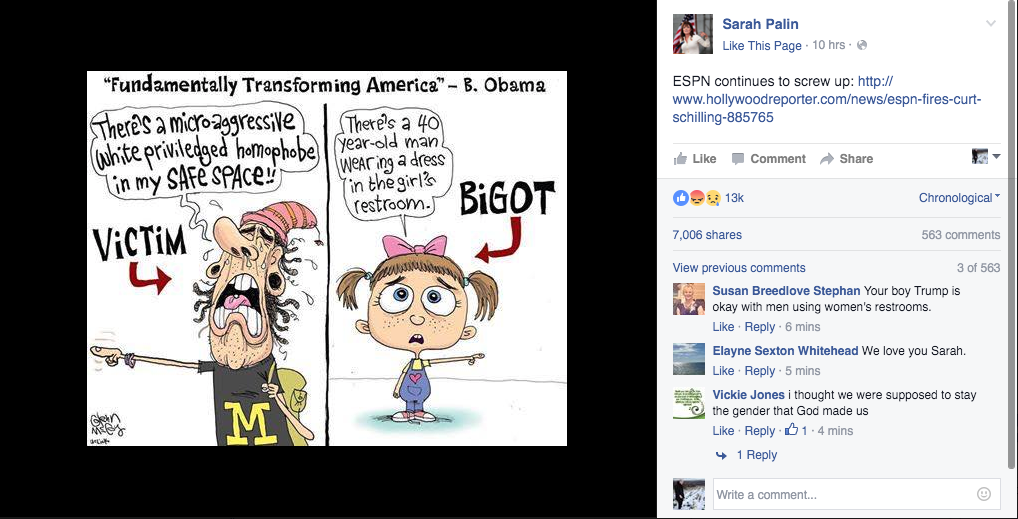Commenting on his own post Schilling wrote: “A man is a man no matter what they call themselves. I don’t care what they are, who they sleep with, men’s room was designed for the penis, women’s not so much. Now you need laws telling us differently? Pathetic.”
