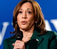 The crowd shouted at the man with two men shoving him and the third, sporting a ‘Gays for Trump’ shirt, grabbing the protestor and putting him in a headlock.