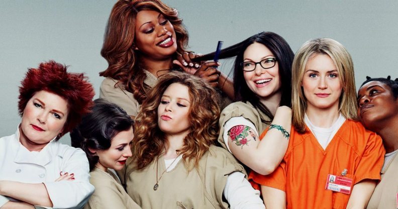 The cast of Orange is the New Black, set in a female prison and featuring a trans woman inmate played by Laverne Cox (Netflix)