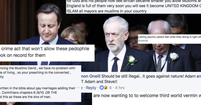 But many replied to the posts by Mr Cameron and Mr Corbyn with abuse comparing gay people to paedophiles, blaming Muslims for anti-LGBT prejudice in the UK and even asking why straight, cisgender white men are not included in the LGBT+ acronym.