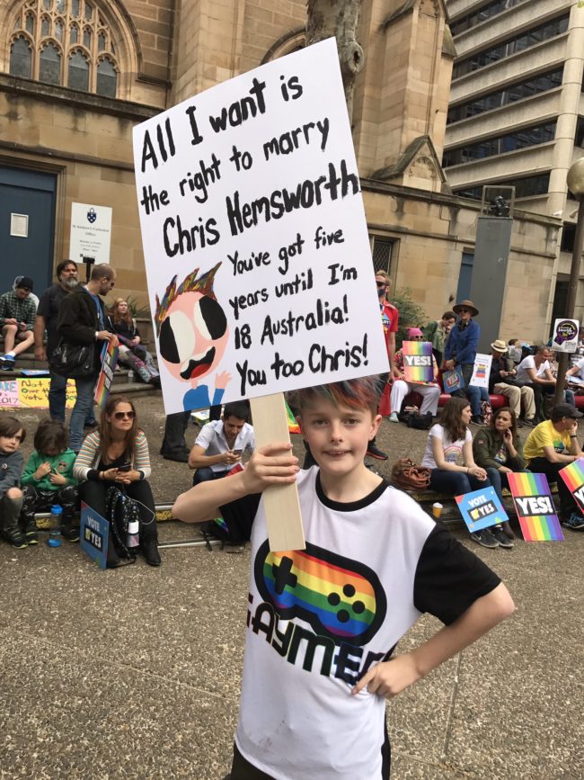 The kid, who turns 13 in November, continued: “I decided to march on Sunday because I think it’s fair that all Australians have the right to marry if they choose to.