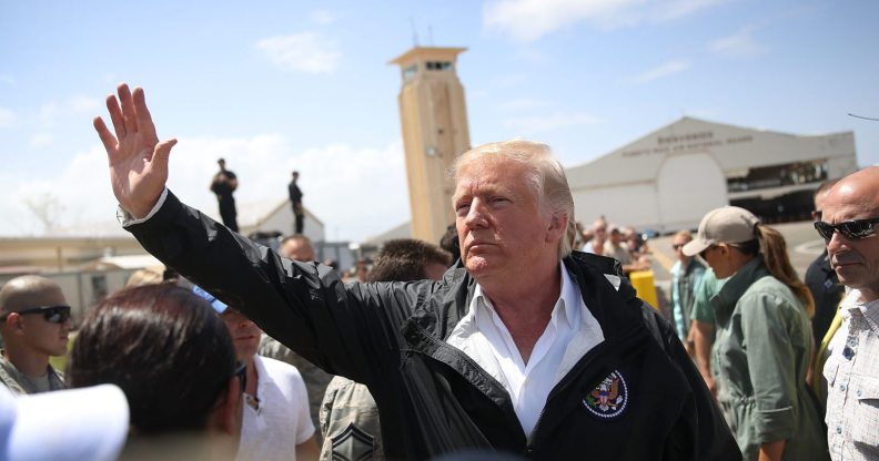 CAROLINA, PUERTO RICO – OCTOBER 03: President Donald Trump waves as he arrives at the Muniz Air National Guard Base for a visit after Hurricane Maria hit the island on October 3, 2017 in Carolina, Puerto Rico. The President has been criticized by some that say the governmentÕs response has been inadequate. (Photo by Joe Raedle/Getty Images)