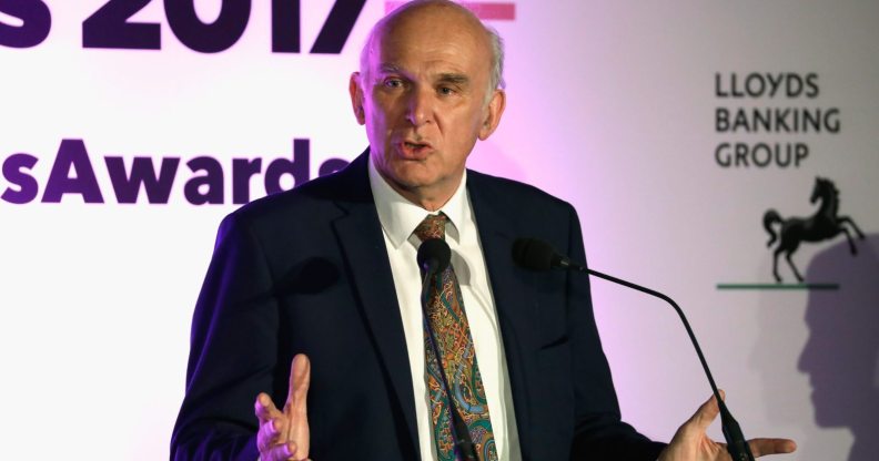 LONDON, ENGLAND – OCTOBER 18: Liberal Democrat Leader Vince Cable speaks on stage during the Pink News Awards 2017 held at One Great George Street on October 18, 2017 in London, England. (Photo by John Phillips/Getty Images)
