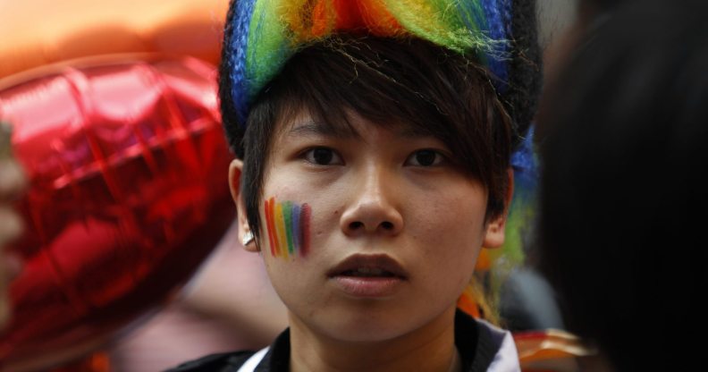 A supporter of the lesbian, gay, bisexual and transgender community (LGBT) takes part in the Hong Kong gay pride parade on November 12, 2011. More than 2,000 people marched in Hong Kong’s gay pride parade November 12, filled with music, dancing and calls for the enactment of laws to ban discrimination against homosexuals. AFP PHOTO / Dale de la Rey (Photo credit should read DALE de la REY/AFP/Getty Images)