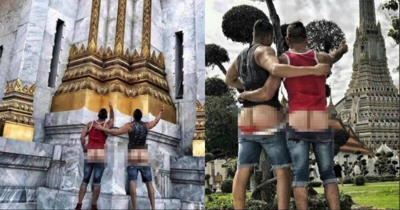 A gay couple is to be deported from Thailand after exposing their naked buttocks in front of a sacred temple.