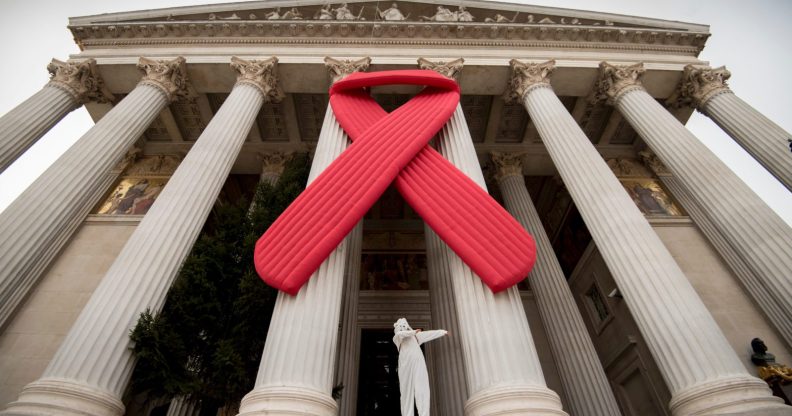 The Austrian Parliament decorated with a large AIDS ribbon (Photo by JOE KLAMAR/AFP/Getty Images)
