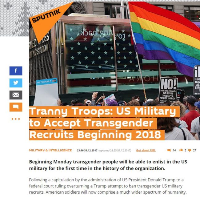 State-controlled Russian media outlet Sputnik News jumped on the news with a headline mocking “Tranny Troops”.