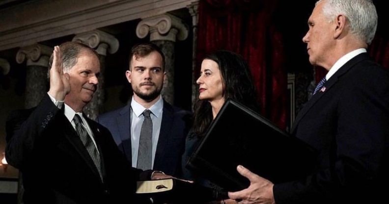 Jones was sworn in yesterday as a US Senator after a surprise defeat for anti-LGBT Republican Roy Moore in the election last month.