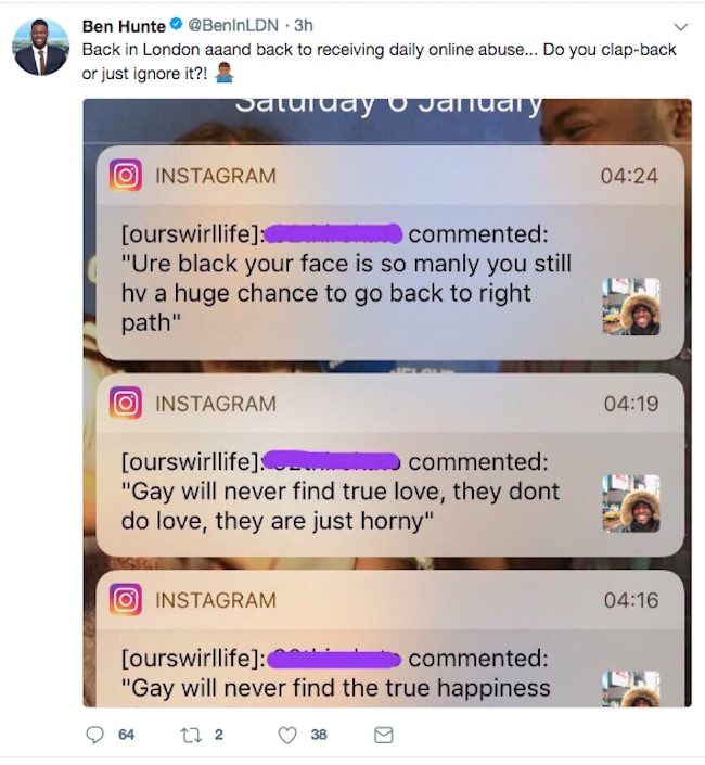 Hunte later posted: “We need to end trolling. EVERY SINGLE THING I post online receives abuse from racists & homophobes. I can take it, but there are many vulnerable people who can’t. Disgusting.”