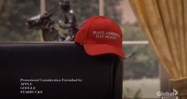 The show includes one unsubtle jab at Trump – with Grace leaving a ‘Make America Gay Again’ hat in the Oval Office.