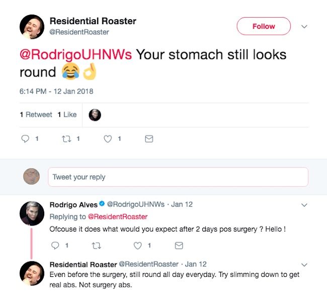 The clinic later posted: “Our first male #RibRemoval @rodrigoalvesuk the verdict is out if Rodrigo is the first gentleman to have his #ribs removed! Watch our #Live #Feed to #Witness #History!!”