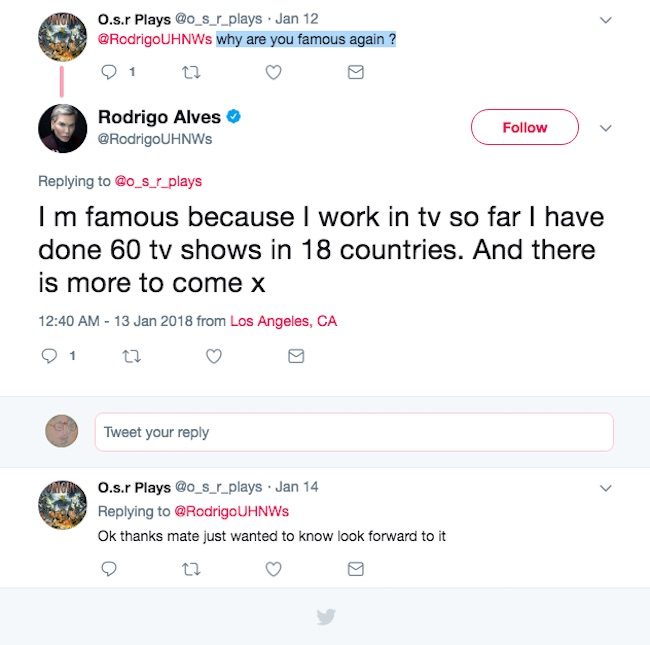 Rodrigo added in a later tweet: “I’m famous because I work in tv so far I have done 60 tv shows in 18 countries. And there is more to come x.”