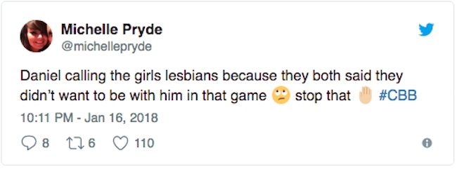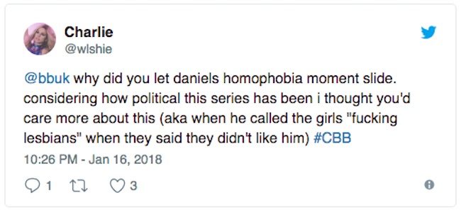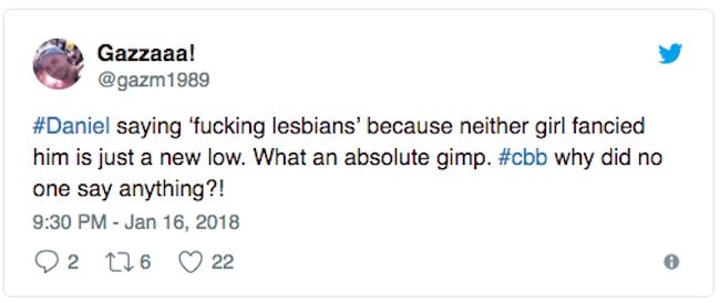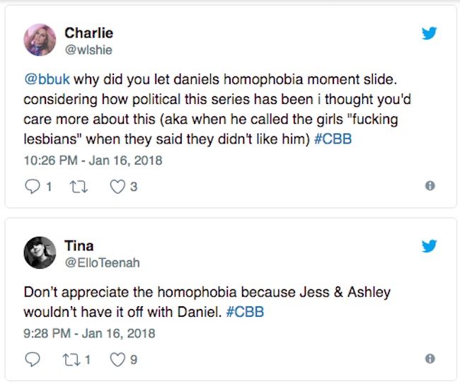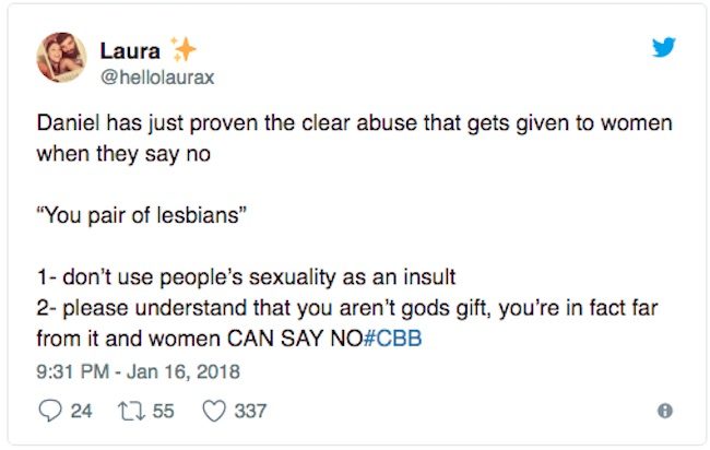 One wrote: “Daniel has just proven the clear abuse that gets given to women when they say no ‘You pair of lesbians’. 1- don’t use people’s sexuality as an insult. 2- please understand that you aren’t gods gift, you’re in fact far from it and women CAN SAY NO#CBB.”