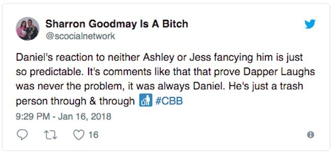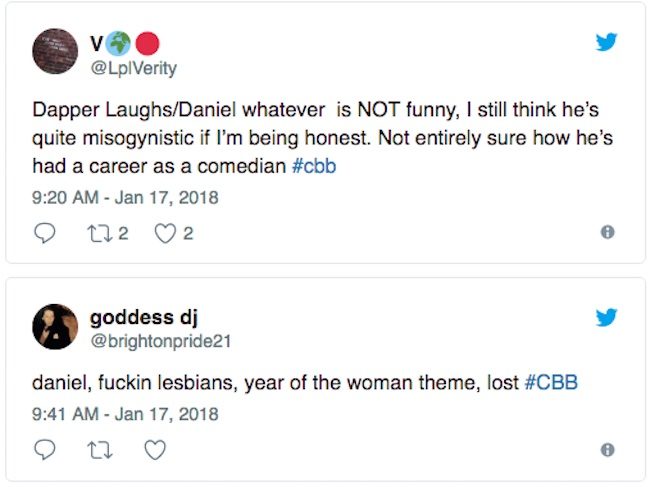 Another added: “Dapper Laughs/Daniel whatever is NOT funny, I still think he’s quite misogynistic if I’m being honest. Not entirely sure how he’s had a career as a comedian #cbb.”