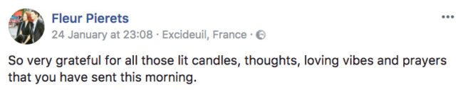 Following the cremation, Pierets wrote that she was “so very grateful for all those lit candles, thoughts, loving vibes and prayers that you have sent this morning.”