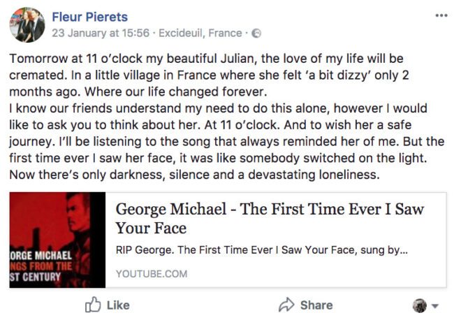 Her wife, Fleur Pierets, announced the tragic news on Facebook.