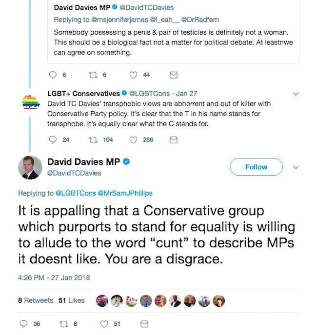 Davies, the Conservative MP for Monmouth, is one of the most virulent opponents of transgender rights in the House of Commons, repeatedly making offensive jokes at the expense of trans people and appearing in the media to call for transgender equality to be rolled back.