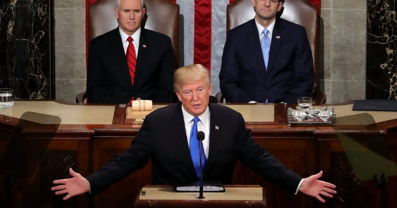 WASHINGTON, DC – JANUARY 30: U.S. President Donald J. Trump delivers the State of the Union address as U.S. Vice President Mike Pence (L) and Speaker of the House U.S. Rep. Paul Ryan (R-WI) (R) look on in the chamber of the U.S. House of Representatives January 30, 2018 in Washington, DC. This is the first State of the Union address given by U.S. President Donald Trump and his second address to a joint meeting of Congress. (Photo by Chip Somodevilla/Getty Images)