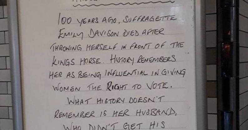 “100 years ago, suffragette Emily Davison died after throwing herself in front of the king’s horse,” read the board.
