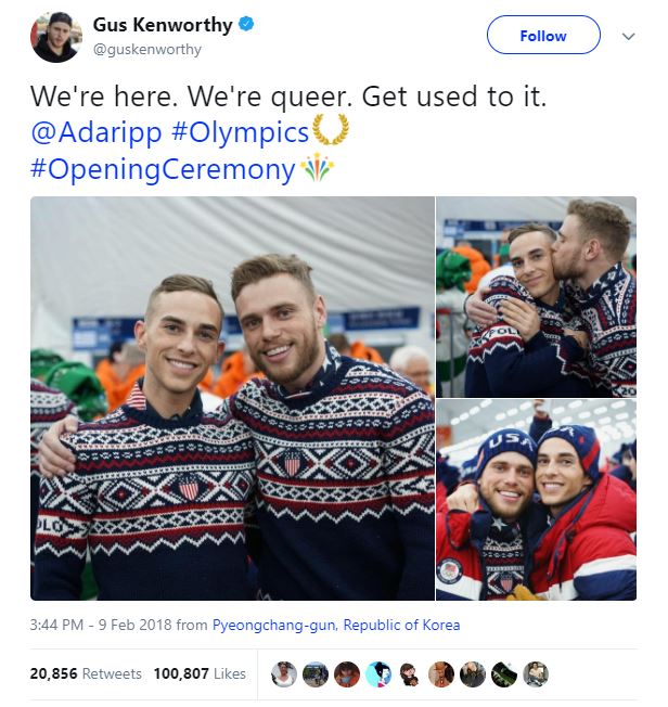 Tagging Rippon in a post, Kenworthy wrote: “We’re here. We’re queer. Get used to it. @Adaripp #Olympics #OpeningCeremony”