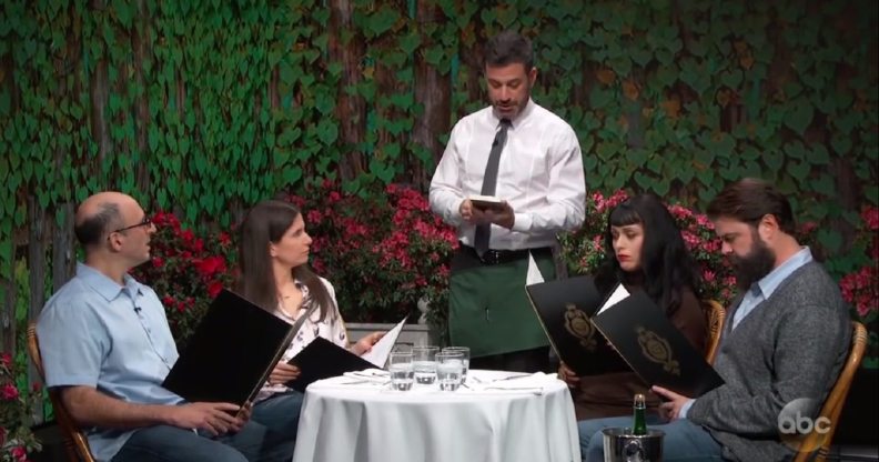 In the skit, ‘Food for Thought’, Kimmel plays a waiter at a restaurant.