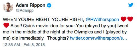 “Also!! Quick movie idea for you: You (played by you) tweet me in the middle of the night at the Olympics and I (played by me) die immediately. Thoughts?”