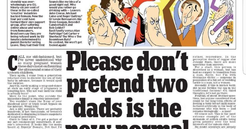 “Even more alarming was the national newspaper carrying a headline asserting that we shouldn’t ‘pretend two dads is the new normal’ and making the case that ‘children benefit most from being raised by a man and woman’. It’s deeply depressing that we’re still even having this conversation. Being a good parent has nothing to do with sexual orientation or whether a child has two mums or two dads.