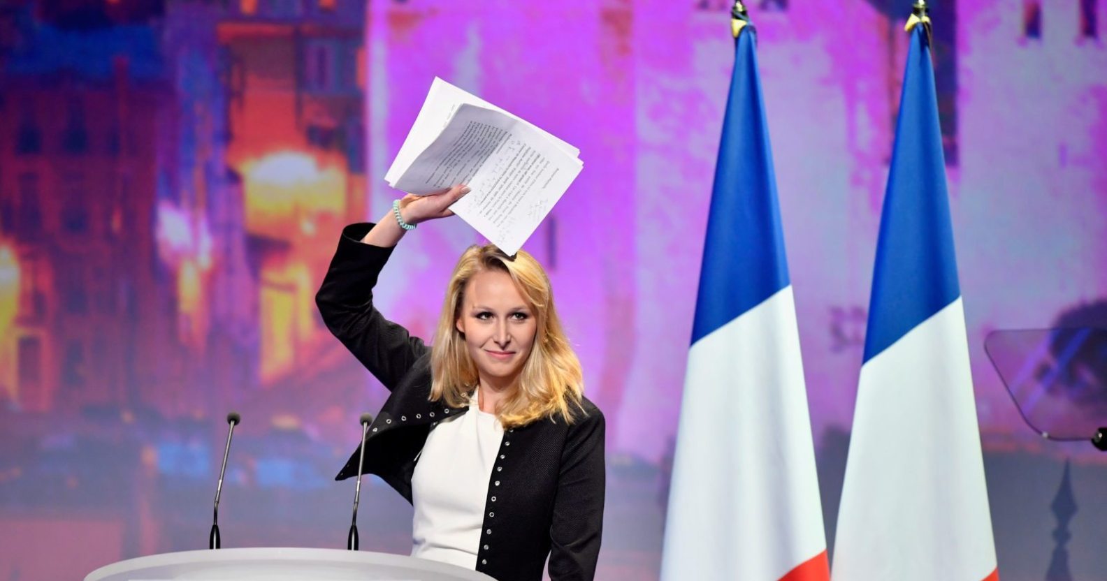 MARSEILLE, FRANCE – APRIL 19: French far-right Front National deputy Marion Marechal Le Pen gestures on stage during a campaign meeting of French presidential election candidate Marine Le Pen on April 19, 2017 in Marseille, France. One of the most unpredictable French elections is being closely fought, with National Front leader promising to protect the electorate from globalization. The 48 year old daughter of the party founder Jean Marie Le Pen has manifesto pledges such as taxing job contracts for non-nationals and proposing to leave the euro zone. (Photo by Jeff J Mitchell/Getty Images)