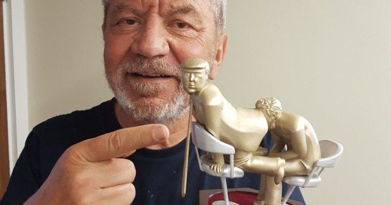 Lord Alan Sugar has shown off a paperweight of Piers Morgan in a compromising position with Donald Trump.