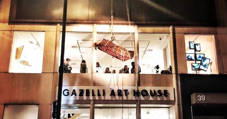 They then suspended themselves outside of the Gazelli art gallery in Dover Street for five hours.