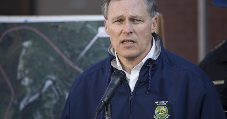 ARLINGTON, WA – MARCH 23: Washington Governor Jay Inslee addresses the media during a press conference after a deadly mudslide on March 23, 2014 in Arlington, Washington. Four people have been confirmed dead and at least 18 others are still missing after a massive mudslide in Oso, Washington. (Photo by David Ryder/Getty Images)