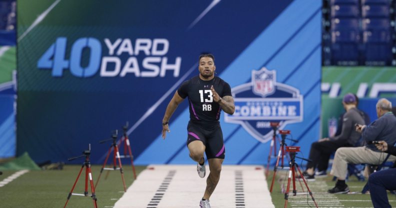 INDIANAPOLIS, IN - MARCH 02: LSU running back Derrius Guice runs the 40-yard dash during the 2018 NFL Combine at Lucas Oil Stadium on March 2, 2018 in Indianapolis, Indiana. (Photo by Joe Robbins/Getty Images)