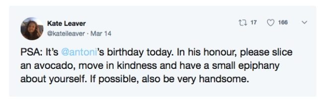 “PSA: it’s @antonis birthday today. In his honour, please slice an avocado, move in kindness and have a small epiphany about yourself. If possible, be very handsome,” wrote writer and author Kate Leaver.