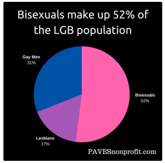 According to PAVES, a not for profit organisation that advocates for bi and pansexual people, 52 percent of the LGBT+ population identify as bisexual.