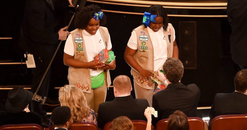HOLLYWOOD, CA – FEBRUARY 28: Girl Scouts sell cookies to audience members during the 88th Annual Academy Awards at the Dolby Theatre on February 28, 2016 in Hollywood, California. (Photo by Kevin Winter/Getty Images)