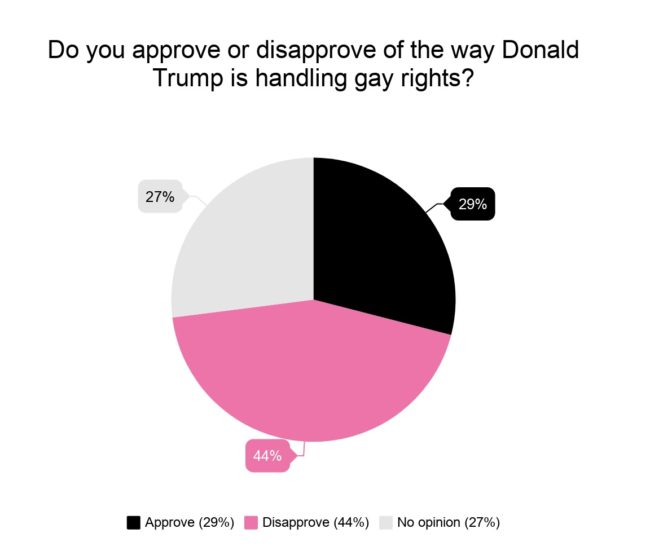 44 percent of Americans said they strongly or somewhat disapproved of the way Trump was handling “gay rights”, compared to just 29 percent who strongly or somewhat approved of his handling of the issue. 27 percent had no opinion.