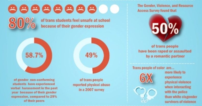 They include the fact that 80 percent of trans students feel unsafe at school, 50 percent have been raped or assaulted by a romantic partner and 41 percent have attempted suicide.