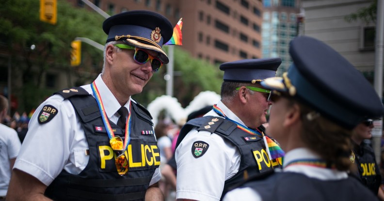 TORONTO, CANADA – JULY 3: Ken Leppert (L) of the Ontario Provincial Police, speaks with colleagues at the annual Pride Festival parade, July 3, 2016 in Toronto, Ontario, Canada. Prime Minister Justin Trudeau will make history as the first Canadian PM to march in the parade. (Photo by Ian Willms/Getty Images)