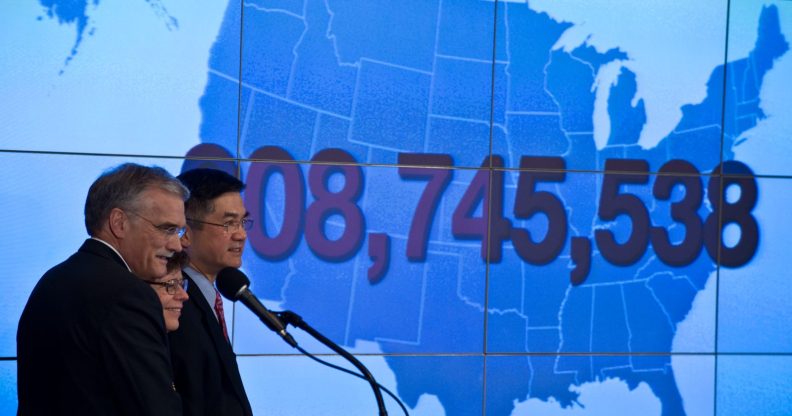 Director of the US Census Bureau Robert Groves (L), Acting Deputy Commerce Secretary Rebecca Blank (C) and US Commerce Secretary Gary Locke stand in front of the new figure of the US population during a press conference to present the first set of 2010 census data at the National Press Club in Washington,DC on December 21, 2010. As of April 1, 2010 the US population stood at 308,745,538. AFP PHOTO/Nicholas KAMM (Photo credit should read NICHOLAS KAMM/AFP/Getty Images)