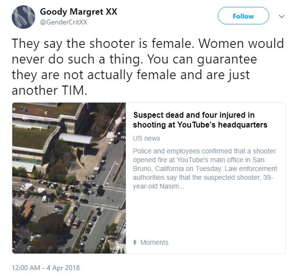 The user wrote: “They say the shooter is female. Women would never do such a thing. You can guarantee they are not actually female and are just another TIM [Trans-Identified Male].”
