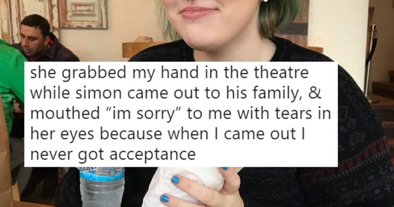 The teenager said that “she grabbed my hand in the theatre while simon came out to his family, & mouthed ‘I’m sorry’ to me with tears in her eyes because when I came out I never got acceptance.”