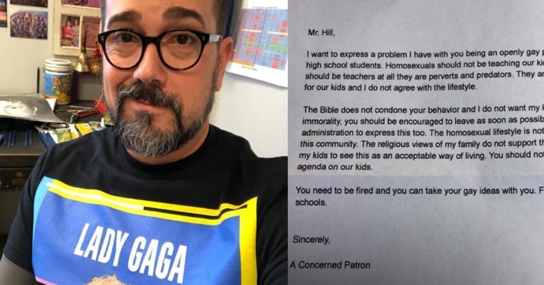 The first letter, sent to Hill at school, ends by calling for Hill to be terminated. It said: “You should not be allowed to push some gay agenda on our kids.