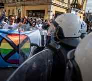However the situation grows out of hand when a group of violent homophobes – depicted wearing grey militaristic uniforms and waving Polish flags – threaten the parade.