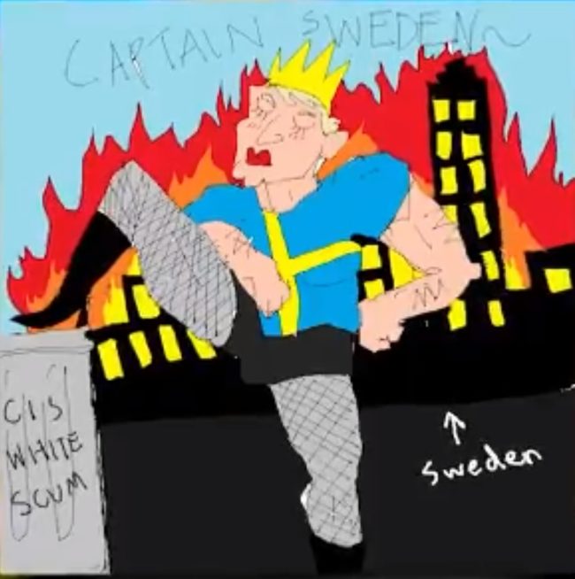 The broadcaster goes on to share homophobic and transphobic artwork created as part of a far-right meme to mock Sweden, showing a ‘Captain Sweden’ in fishnet stockings.
