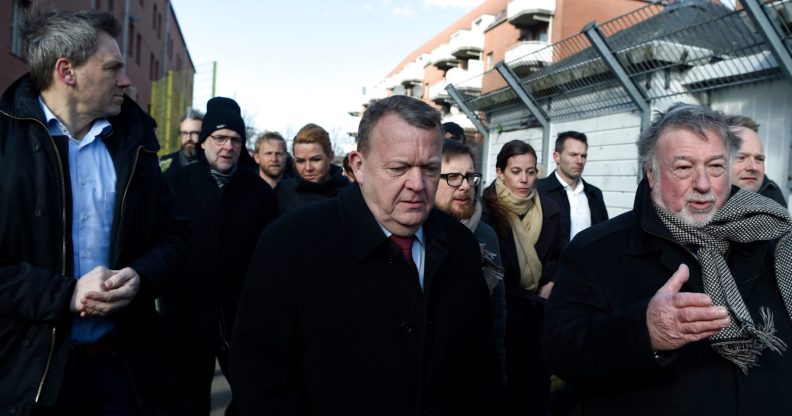 Danish Ministers Inger Stoejberg, Troels Lund Poulsen, Mai Mercado, Simon Emil Ammitzboell-Bille, Lars Loekke Rasmussen (C), Soeren Pape Poulsen, Merete Riisager and Ole Birk Olesen walk in Copenhagen’s Moeljnerpark residential area before a press conference on March 1, 2018.