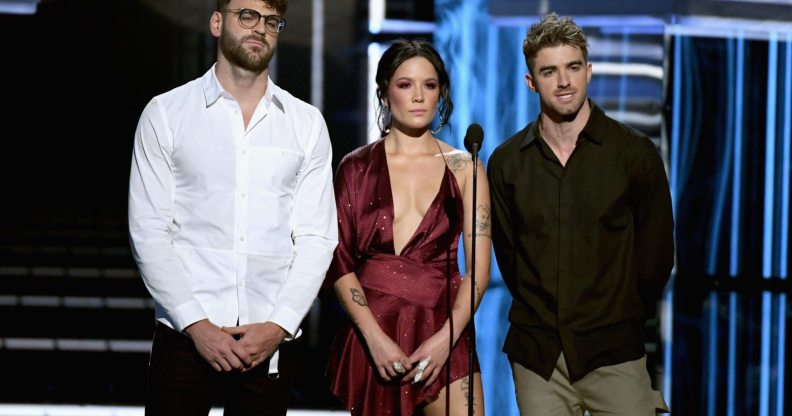 LAS VEGAS, NV - MAY 20: Recording artists Alex Pall (L) and Andrew Taggart (R) of The Chainsmokers and Halsey (C) speak onstage during the 2018 Billboard Music Awards at MGM Grand Garden Arena on May 20, 2018 in Las Vegas, Nevada. (Photo by Ethan Miller/Getty Images)