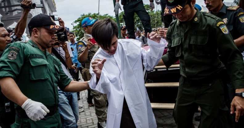 Gay men in Indonesia being led to be lashed 83 times (Ulet Ifansasti/Getty)