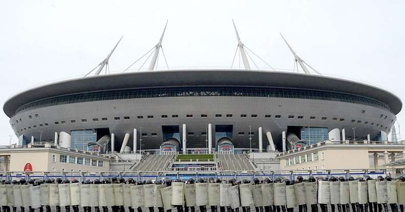 Russian riot policemen take part in special security exercises at the Saint-Petersburg Stadium (Krestovsky Stadium) in Saint Petersburg on April 20, 2018 (OLGA MALTSEVA/AFP/Getty)